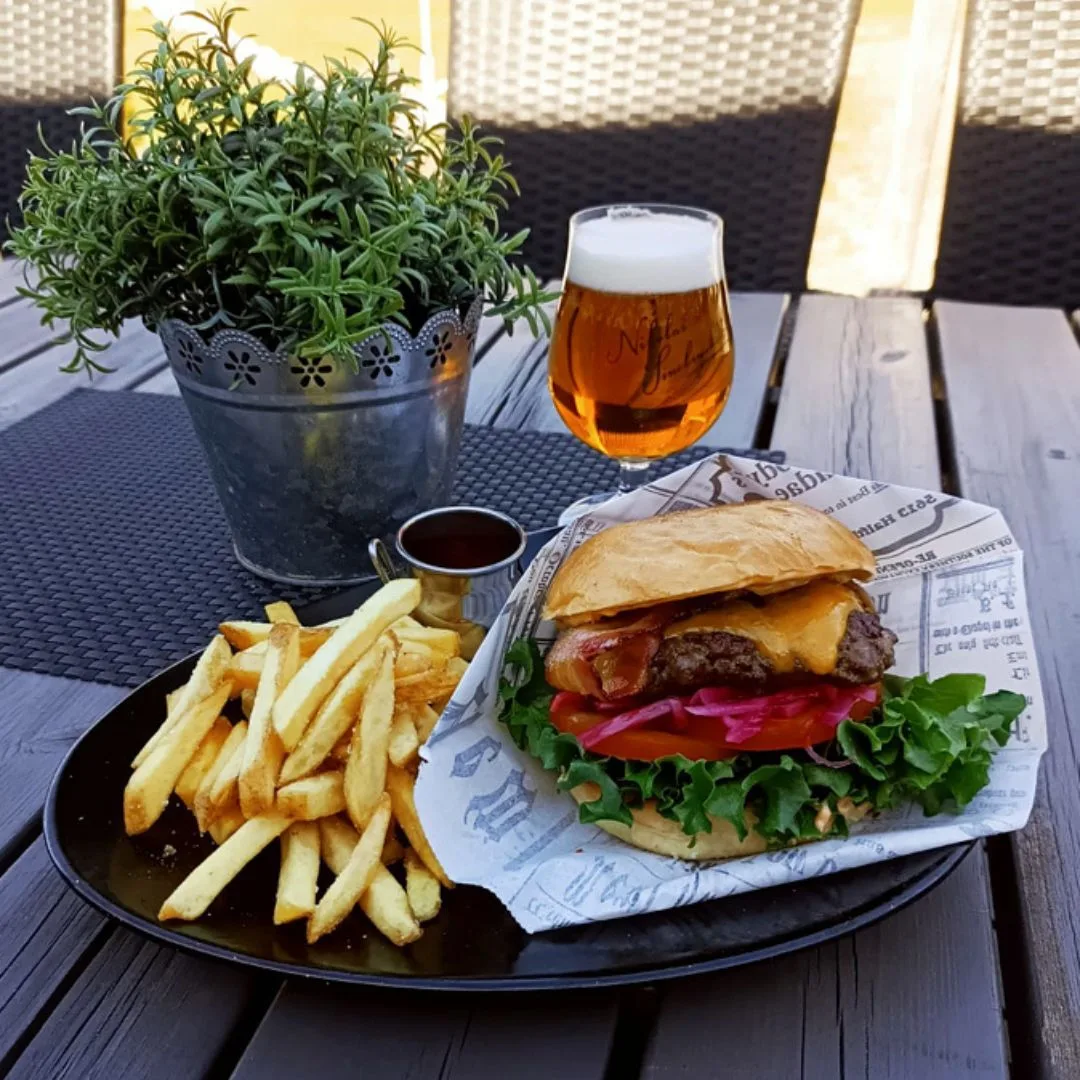 Delicious burgers, salads, and pizzas enjoyed in a former school building or on the cozy terrace.